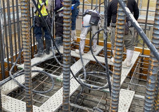 コンクリート工事は仕事のメインイベント。 多能工・型枠大工・鉄筋工のスタッフと共同で行います。床や柱・壁などにコンクリートを流し込んで振動機でしっかり締め固め、丈夫な構造物にする仕事です。
